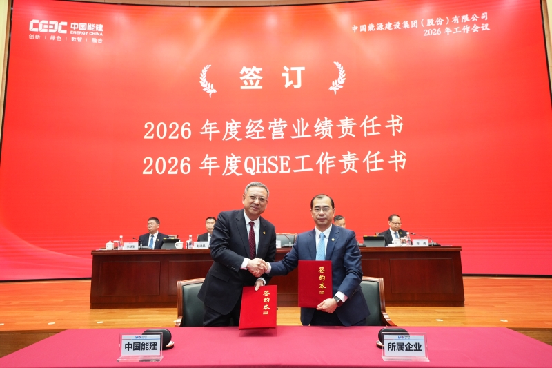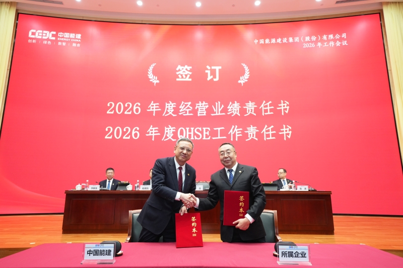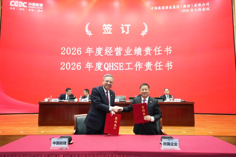 2026年工作會暨二屆一次職代會。中國能建黨委書記、董事長倪真與所屬企業簽訂2026年度經營業績責任書、QHSE工作責任書。